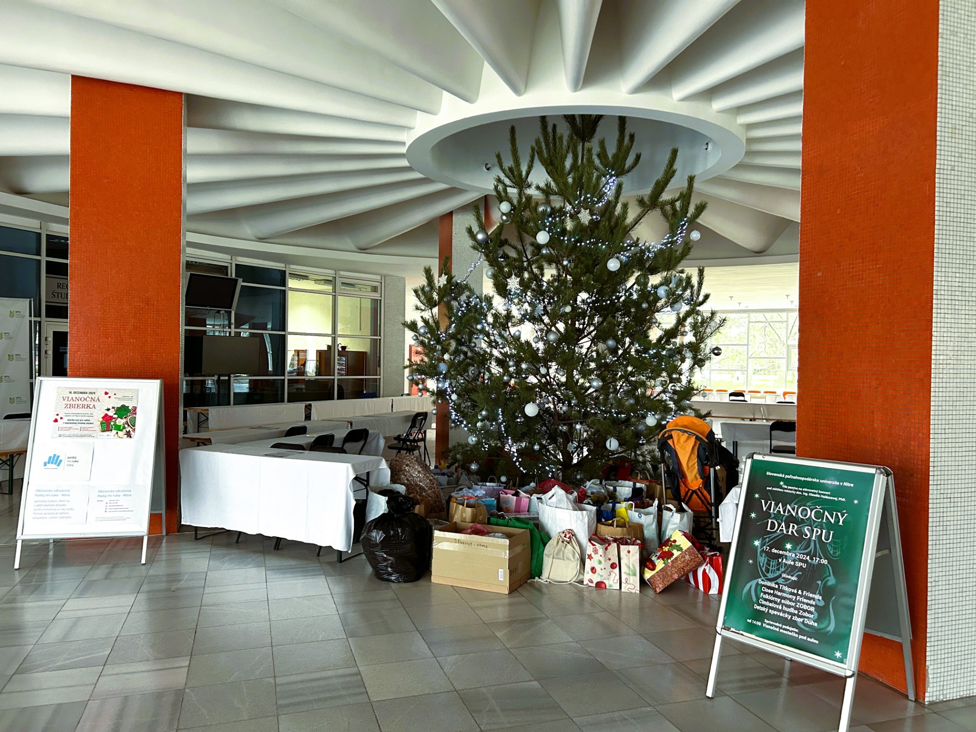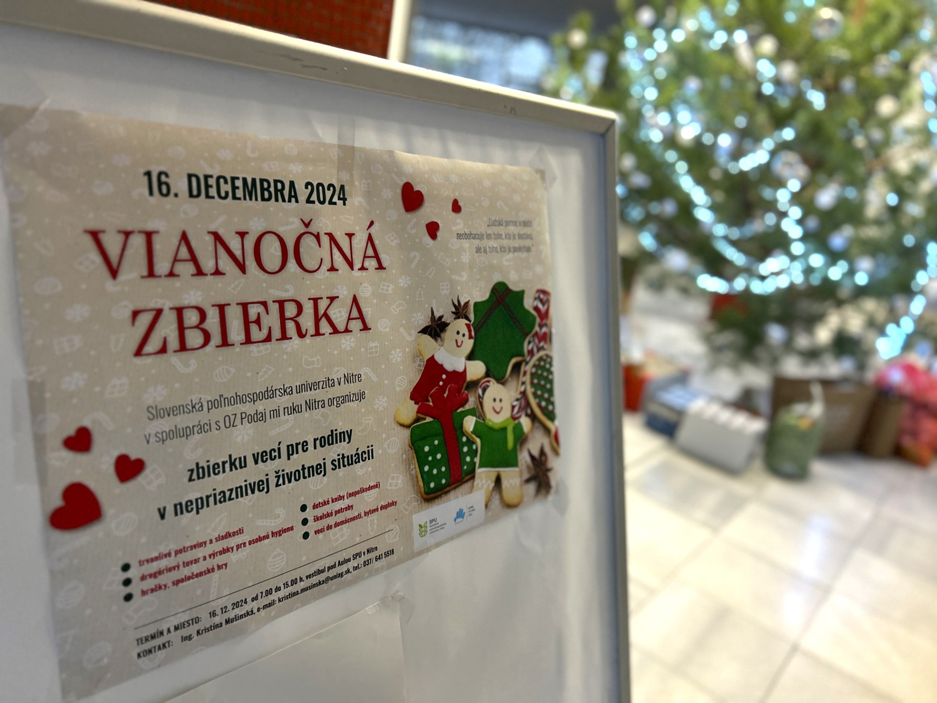Slovenská poľnohospodárska univerzita v Nitre už tradične pred najkrajšími sviatkami roka ukazuje ľudskosť, súcit a podáva pomocnú ruku tým, ktorí to potrebujú. V spolupráci s občianskym združením Podaj mi ruku - Nitra 16. decembra v priestoroch foyera pod aulou zorganizovala charitatívnu vianočnú zbierku vecí pre rodiny v nepriaznivej životnej situácii.