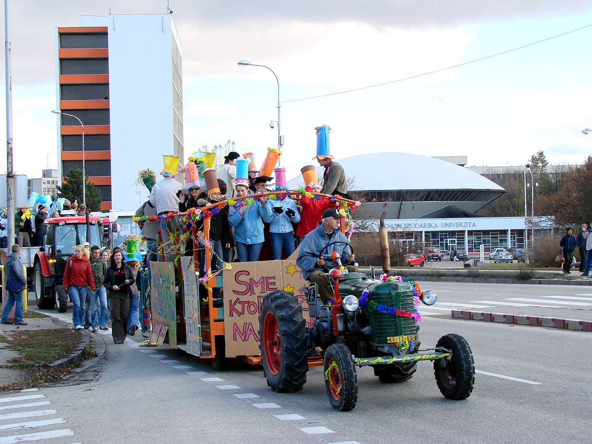 Bývalo zvykom, že na čele sprievodu išla jazda na koňoch z jazdeckého klubu alebo rôzne historické stroje s emblémom - tie pripravovali tradične „mechoši“ (študenti mechanizátori). Ďalej nasledoval koč s primátorom a viceprimátormi fakúlt. Ten ťahal dlhé roky somárik, vypožičaný od istého pána, známej nitrianskej postavičky. Za odplatu mu potom zvyčajne študenti vyčistili chliev. Vozy stvárňovali vždy nejakú alegóriu. Tieto „skryté myšlienky“ bývali rôzne adresné a vychádzali zo študentských nápadov, ale aj z aktuálnej politickej situácie. Nepamätám sa, že by niektorý voz nemohol ísť do sprievodu, ale pri príliš odvážnych námetoch sa určité úpravy museli urobiť. Alegorické vozy sa vyrábali po večeroch dva-tri týždne vopred, najčastejšie v garážach a dielňach školy. Príprava dala dosť práce, ale robilo sa po večeroch, s chuťou a bývalo veselo. Dobrou dušou prípravy alegorických vozov bol dlhé roky doc. Platon Baker - technický „všeumelec“, ktorý pochádzal z Banskej Štavnice a z histórie poznal aj slávne Salamandrové sprievody študentov banskoštiavnickej akadémie. Pochopiteľne, vždy sa čakávalo na nápady mechanizátorov, ktorí dokázali spojazdniť rôzne staré traktory, kombajny a iné mechanizmy, ktoré boli doplnené vtipnými figúrami. Bolo pochopiteľné, že všetko na vozoch sa hýbalo, svietilo a vyrábalo rozmanité zvuky. Študenti stroje vyhľadali a privážali z blízkych, ale aj ďalekých dedín okolo Nitry. Tradične nesmeli chýbať traktory Lanz Buldog, Fordson a iné, vyrobené pred vojnou. Od 90-tych rokov minulého storočia sa staré stroje začali požičiavať zo zbierok Slovenského poľnohospodárskeho múzea, kde pracovali aj absolventi našej školy.