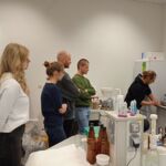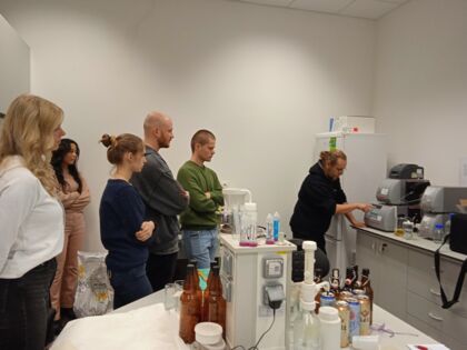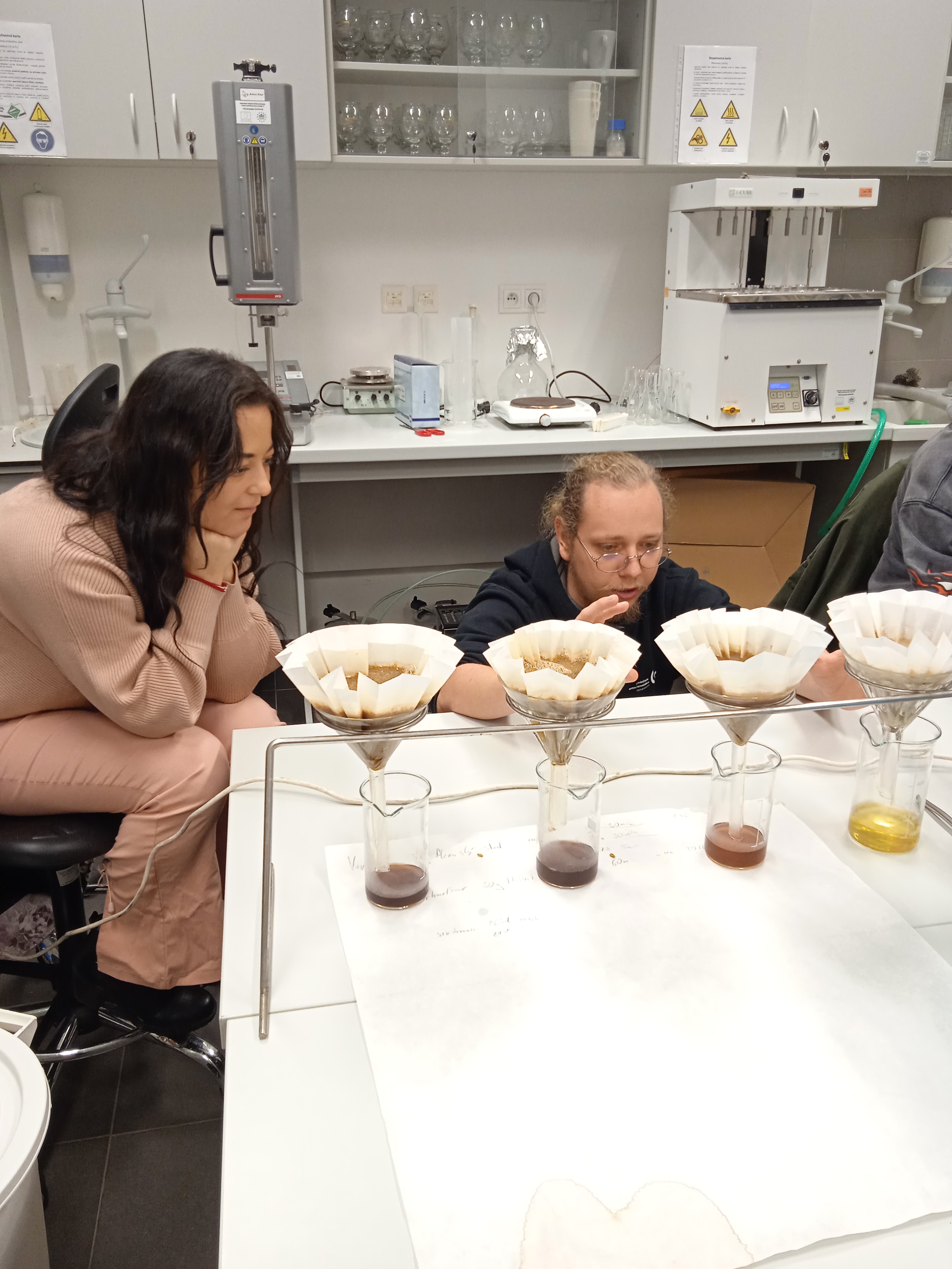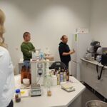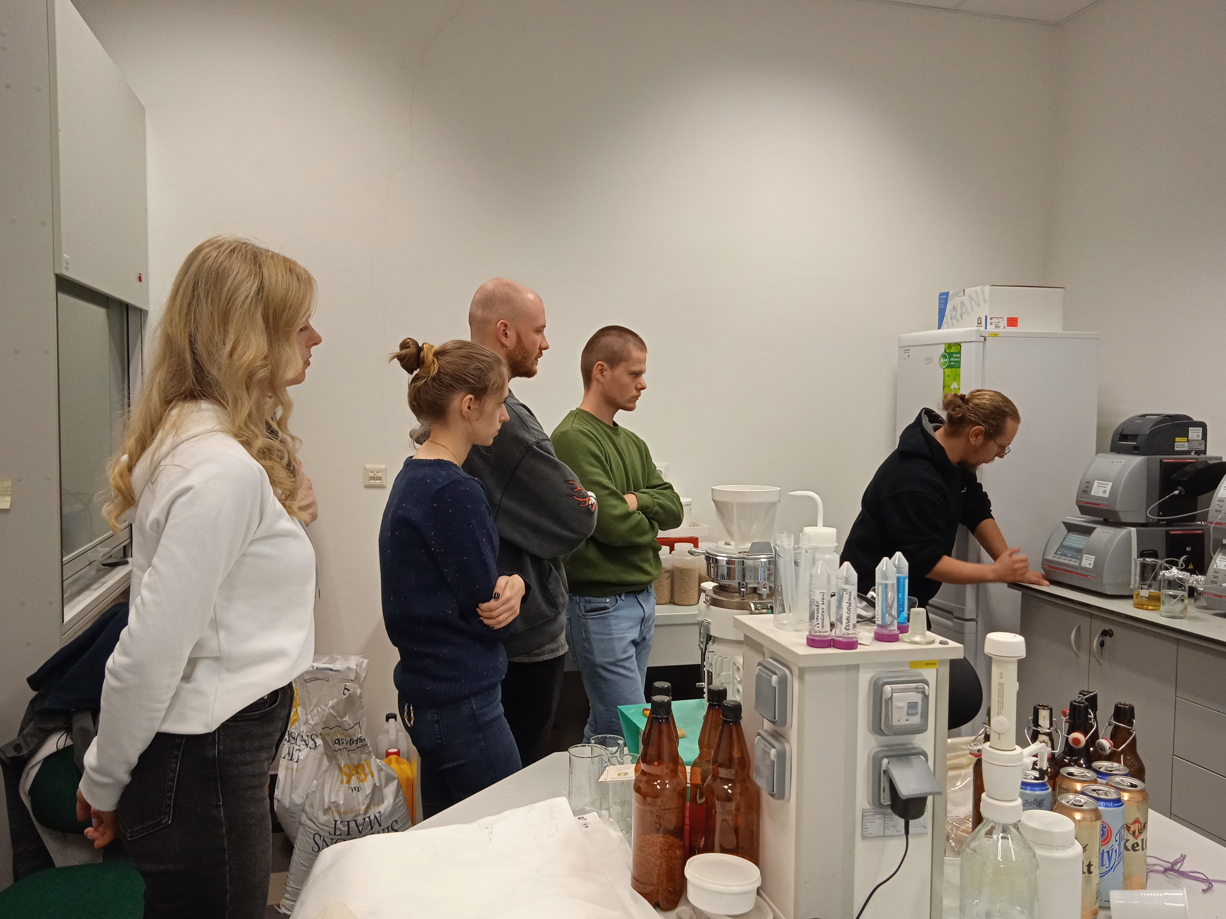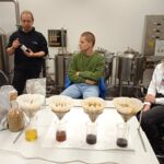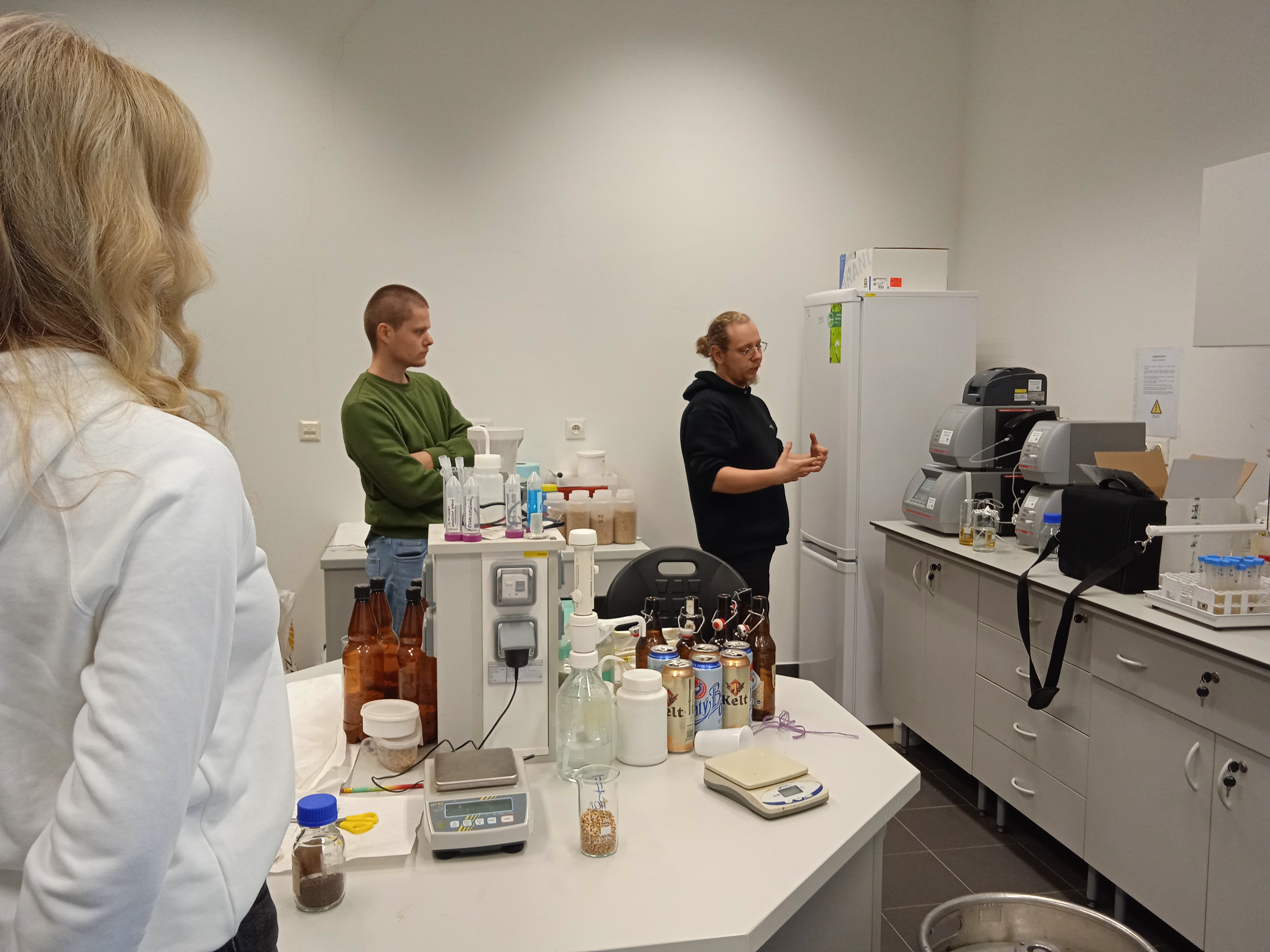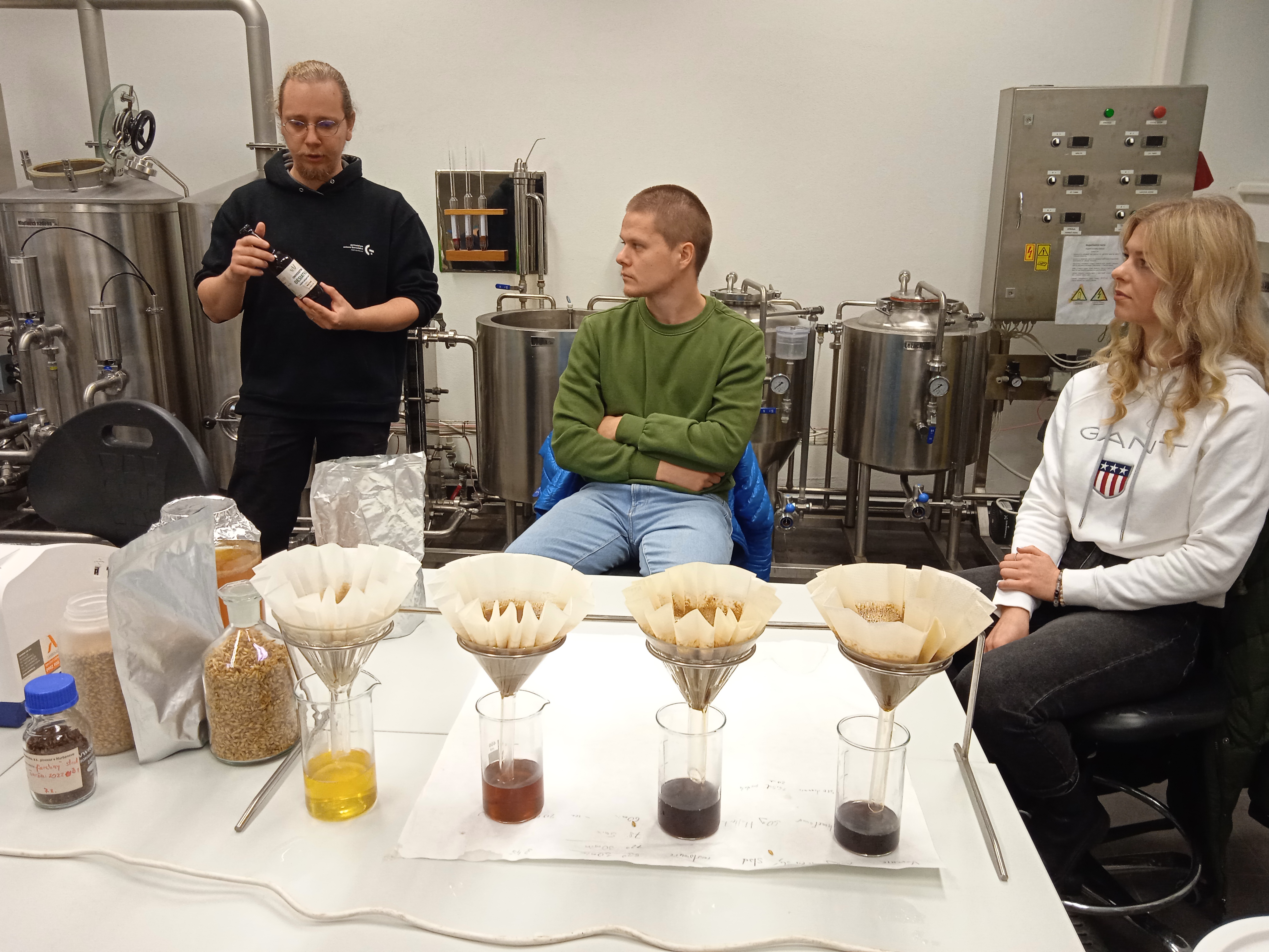 Počas prednášky priblížil proces výroby piva a pripravil experimentálnu sladinu s prídavkom farebných sladov, ktorú zmeral na komplexnom analyzátore piva. Tento špičkový prístroj vo VC AgroBioTech zmeria v priebehu 1 - 2 minút obsah alkoholu, cukru, farbu, pH a zákal piva.