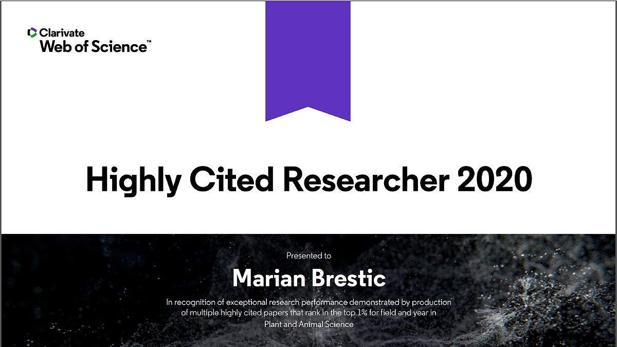 Prof. Ing. Marián Brestič, CSc., a doc. Ing. Marek Živčák, PhD., z Fakulty agrobiológie a potravinových zdrojov Slovenskej poľnohospodárskej univerzity v Nitre získali prestížne svetové ocenenie Highly Cited Researchers 2020, čo ich zaraďuje medzi absolútnu svetovú špičku (top 0,1 % výskumníkov) vo vednej oblasti Plant and Animal Sciences. Odborníci v oblasti ekofyziológie a stresovej fyziológie plodín sa dlhodobo venujú problematike účinkov environmentálnych stresových faktorov na fotosyntetický aparát rastlín a aplikácie neinváznych metód v diagnostike funkčného stavu rastlín. Ocenení vedci sú súčasťou Špičkového tímu identifikovaného Akreditačnou komisiou pri MŠ SR. Prof. M. Brestič je aj minuloročným finalistom súťaže ESET Science Award a víťazom hlasovania o cenu verejnosti 2019.