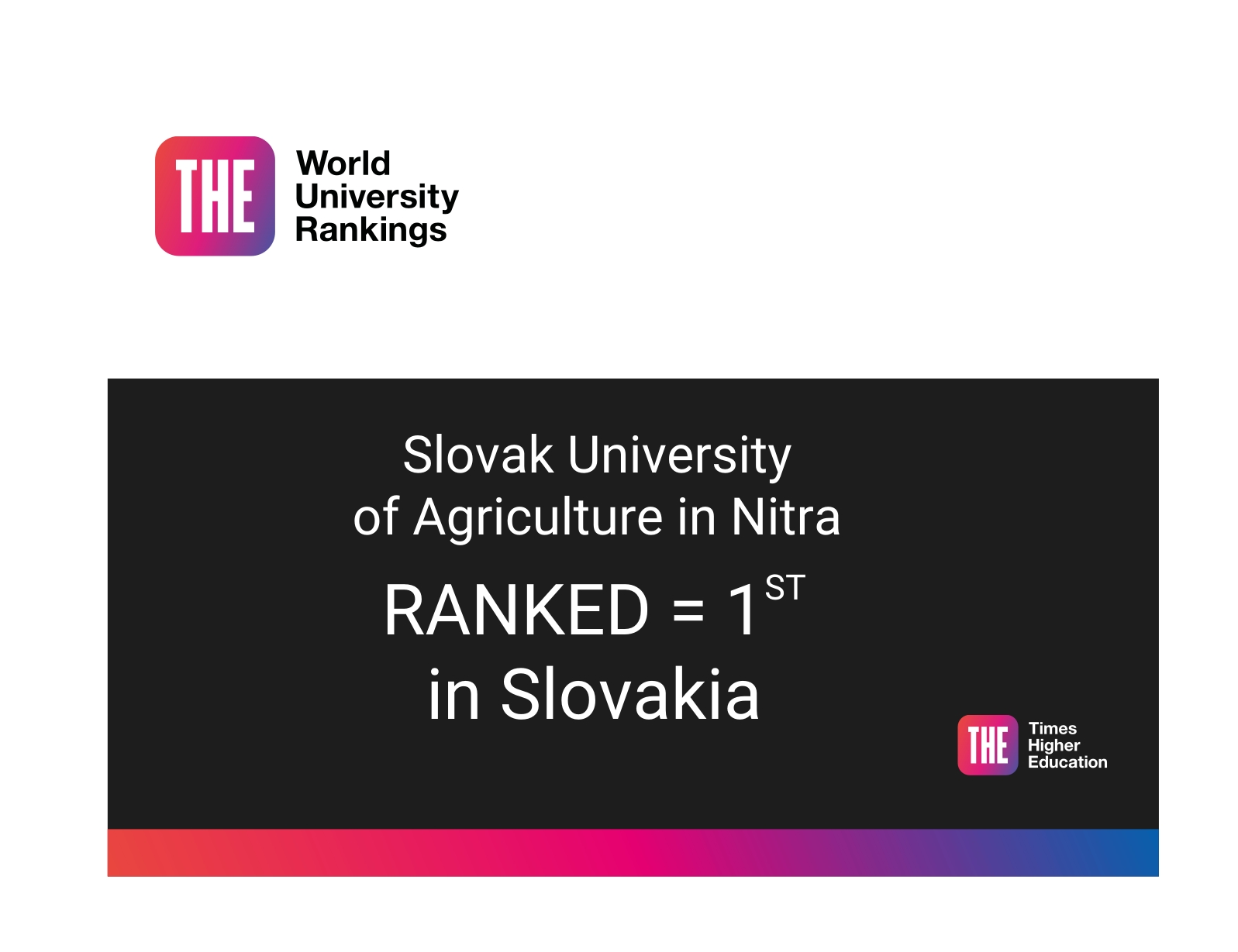 SPU bola v rámci rankingu hodnotená v kategórii Life Sciences, pričom obsadila výbornú 801. - 1000. priečku spolu s Univerzitou Komenského a Slovenskou technickou univerzitou (STU) v Bratislave. Metodika THE WUR hodnotí univerzity na základe 18 ukazovateľov v piatich kľúčových oblastiach: výučba, výskumné prostredie, kvalita výskumu, spolupráca s priemyselnou sférou a medzinárodná spolupráca.