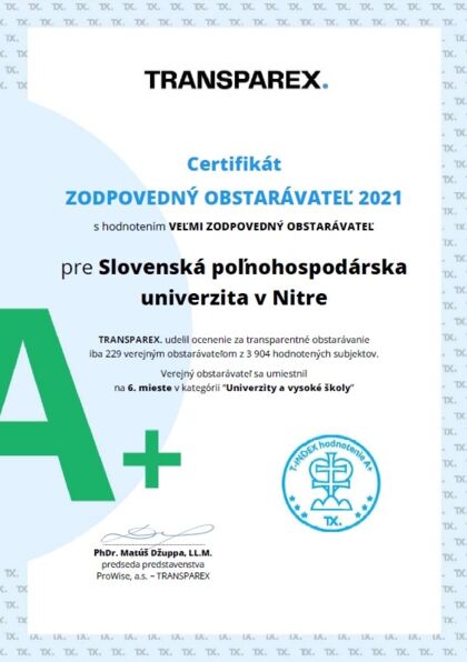 Slovenskej poľnohospodárskej univerzite v Nitre udelili ocenenie Zodpovedný obstarávateľ 2021 za vynikajúce výsledky v oblasti verejného obstarávania v uplynulom roku.