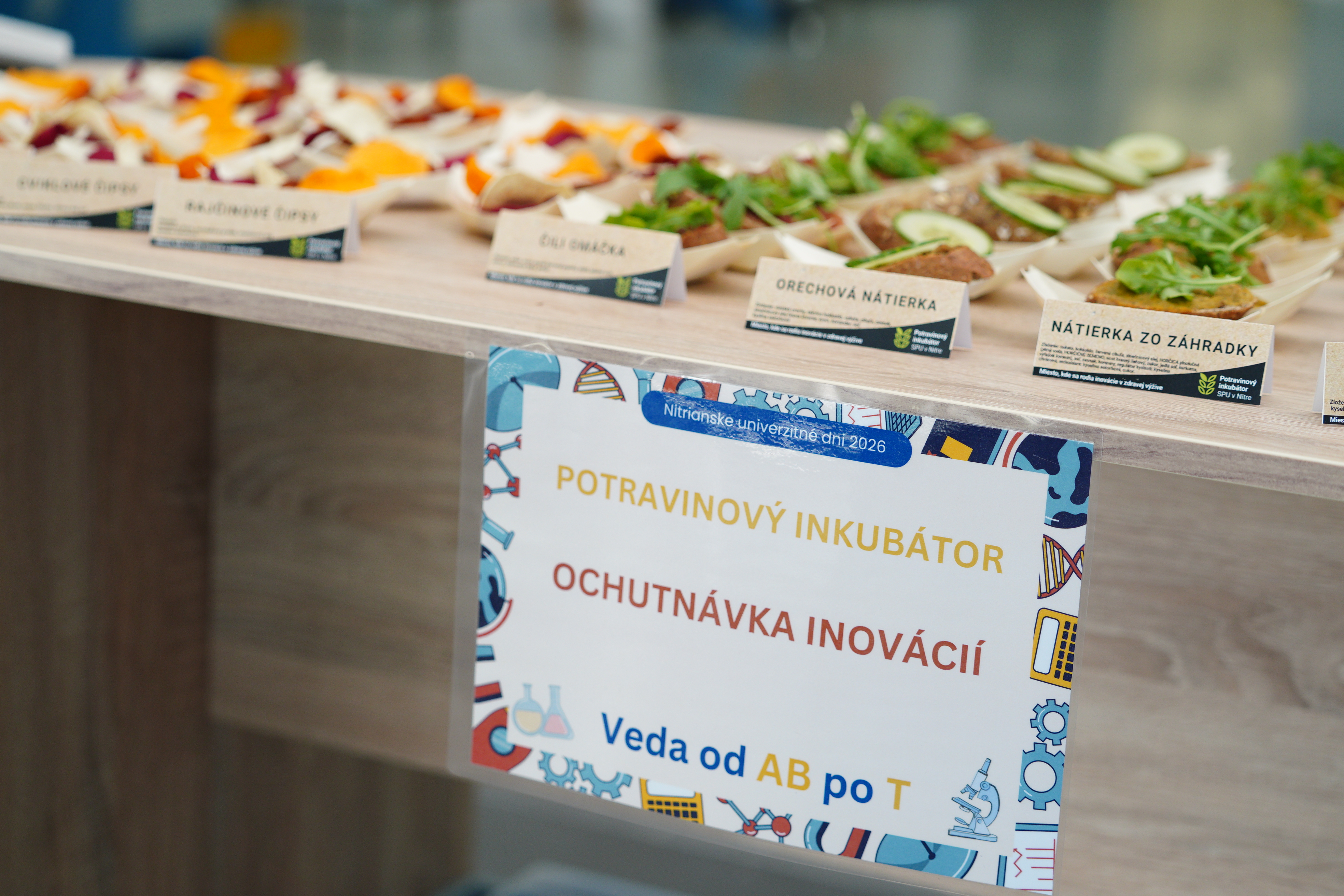 Neoddeliteľnou súčasťou Vedy od AB po T bola prezentácia výrobkov z Potravinového inkubátora SPU – zeleninových čipsov, ovocných snackov a nátierky zo záhradky – spojená s ich ochutnávkou a možnosťou zakúpenia. Zaujala aj ochutnávka nových inovatívnych produktov, ako je nátierka z vlašských orechov a čili omáčka. A keďže stále najviac atraktívnym produktom z dielne Potravinového inkubátora sú zeleninové čipsy, výskumníci rozšírili portfólio o nový druh – rajčinové čipsy, ktoré tiež mohli návštevníci ochutnať. Záujemcovia si ich už čoskoro budú môcť zakúpiť.