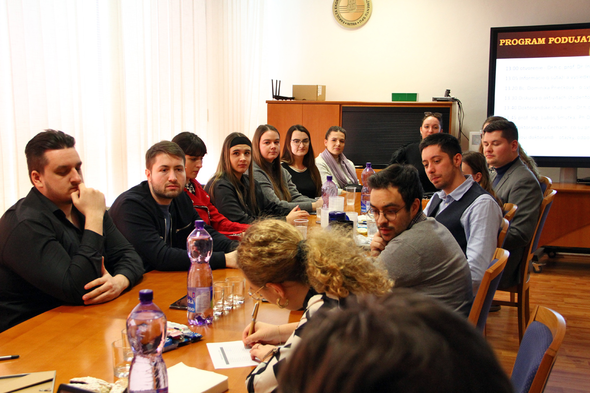 V ďalšej časti stretnutia prodekan doc. Patrik Rovný oboznámil uchádzačov o doktorandské štúdium s ponúkanými študijnými programami, priebehom štúdia a termínmi na podanie prihlášok. K diskusii sa pridali aj hostia z Českej zemědělskej univerzity v Prahe prof. Ing. Ľuboš Smutka, PhD. a doc. Ing. Inna Čábelková, Ph.D. Predstavili vedecký život doktoranda v Čechách a poukázali na možnosti študijných stáží na ich univerzite pre doktorandov SPU.
