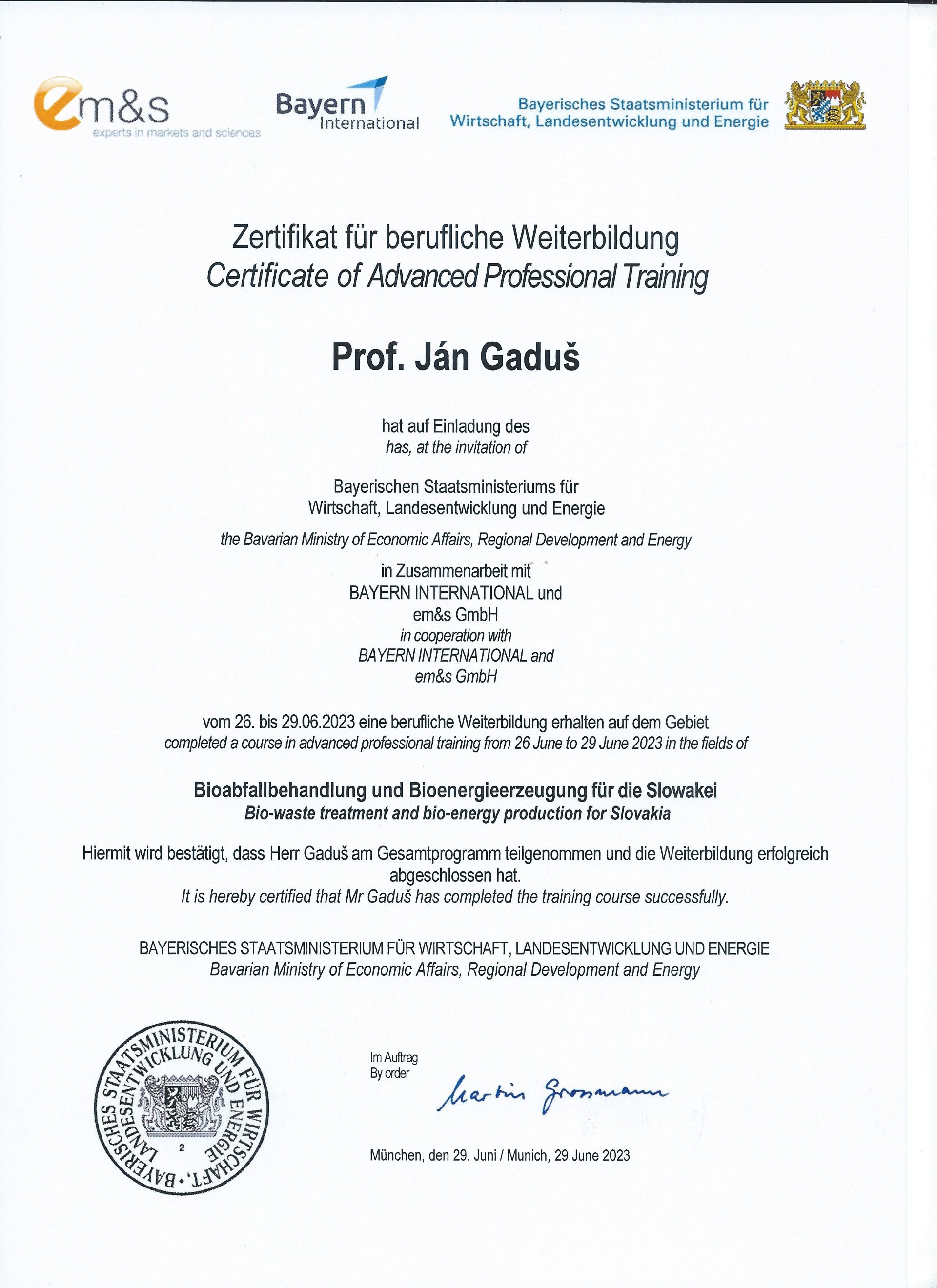 Na základe pozvania Bavorského ministerstva hospodárstva, regionálneho rozvoja a energetiky v Nemecku absolvoval odborník Fakulty európskych štúdií a regionálneho rozvoja Slovenskej poľnohospodárskej univerzity v Nitre profesor Ján Gaduš štvordňový intenzívny kurz nadstavbového odborného vzdelávania v odboroch spracovanie bioodpadu a výroba bioenergie pre Slovensko. Výsledkom je získaný certifikát pre oblasť vzdelávania v odbore spracovania bioodpadu.