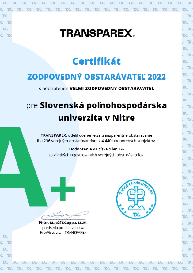 Slovenská poľnohospodárska univerzita v Nitre získala ocenenie Zodpovedný obstarávateľ 2022 za výsledky v oblasti verejného obstarávania v uplynulom roku. V rebríčku hodnotenia sme sa ocitli na popredných priečkach spomedzi 4400 verejných obstarávateľov a získali nadpriemerné hodnotenie A+ Veľmi zodpovedný obstarávateľ.